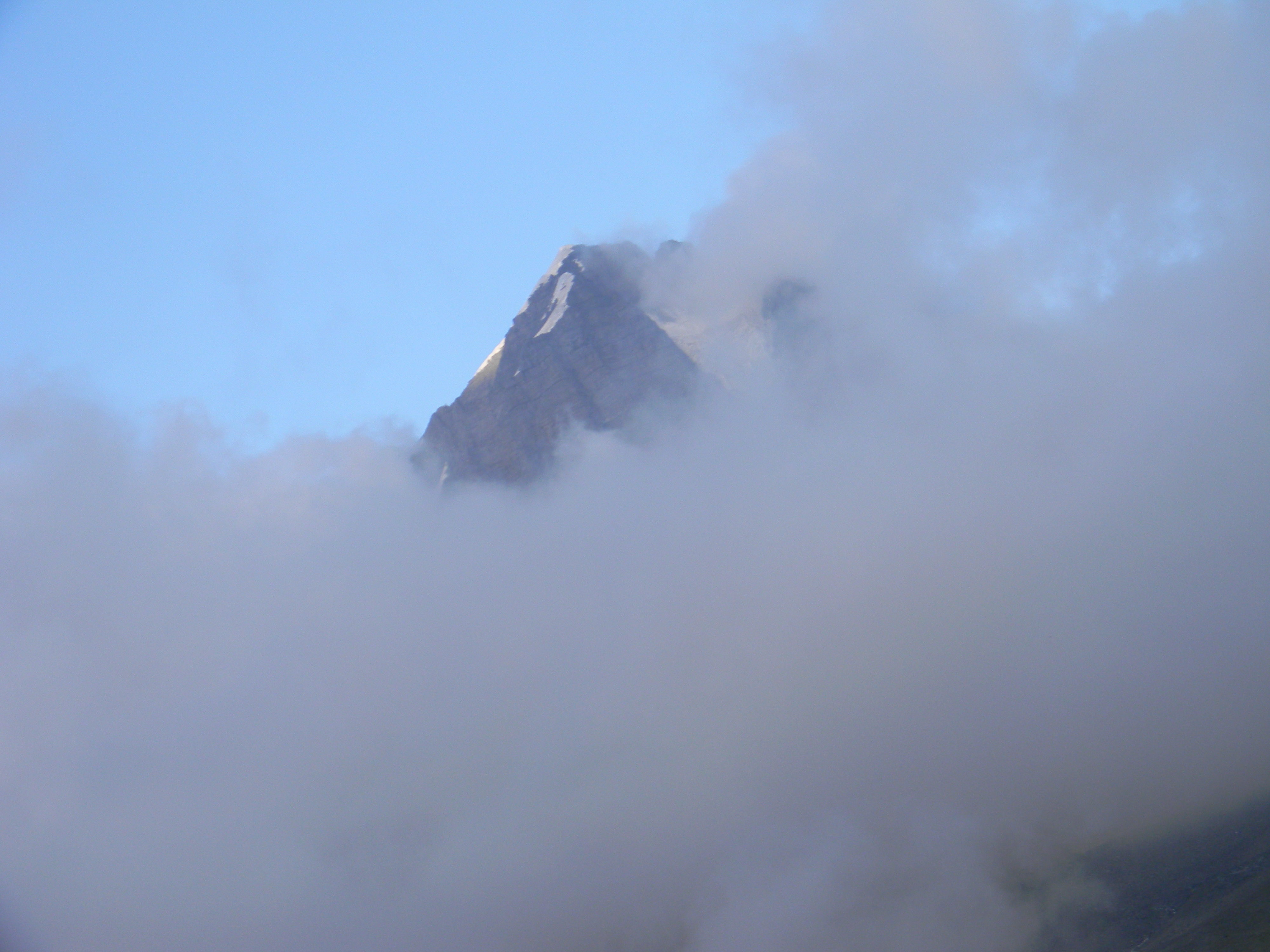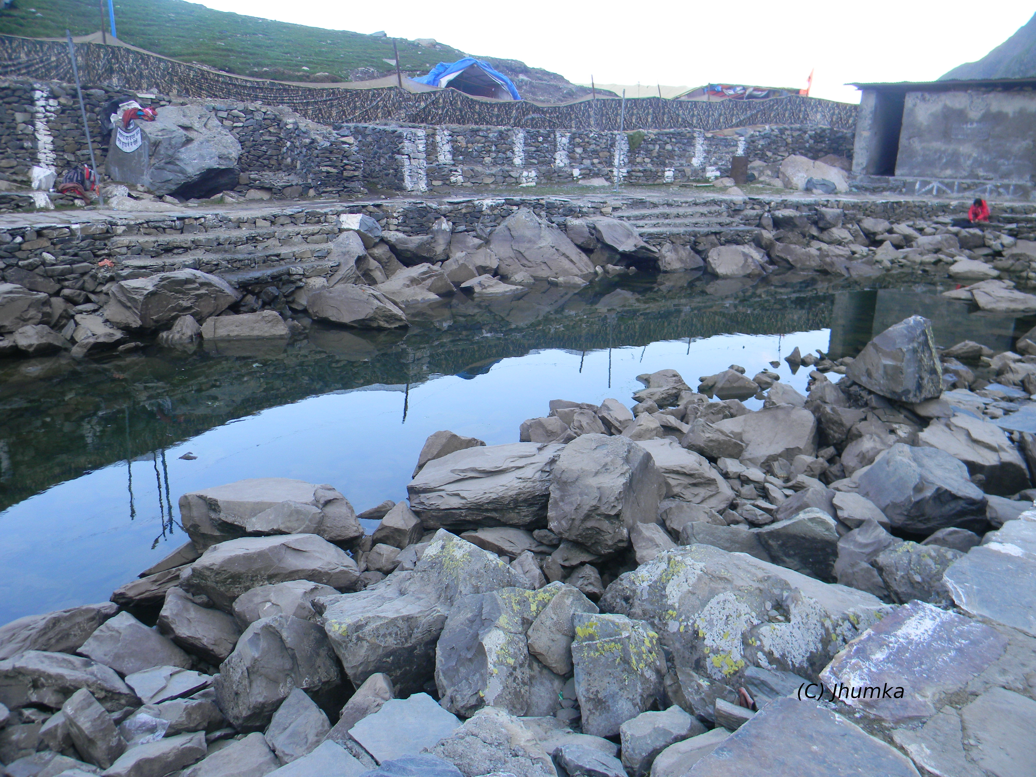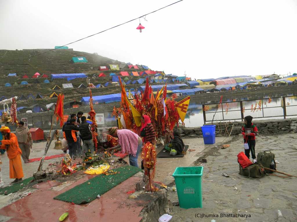 I reached Gaurikund at 4 pm, many people halted there for night stay, but I decided to go up to Shivkund and visit Gaurikund on my way back. Reaching Shivkund, I hired a mountain facing tent with blankets, sharing with another person at the cost of 600 rupees, The mountain was covered with mist, I felt very disappointed. After dinner I came back to tent and tried to take rest. I realized that it was difficult to sleep not only for cold weather but also for a discomfort to stay at an altitude of 4,080 meters ( 13,390 ft ).