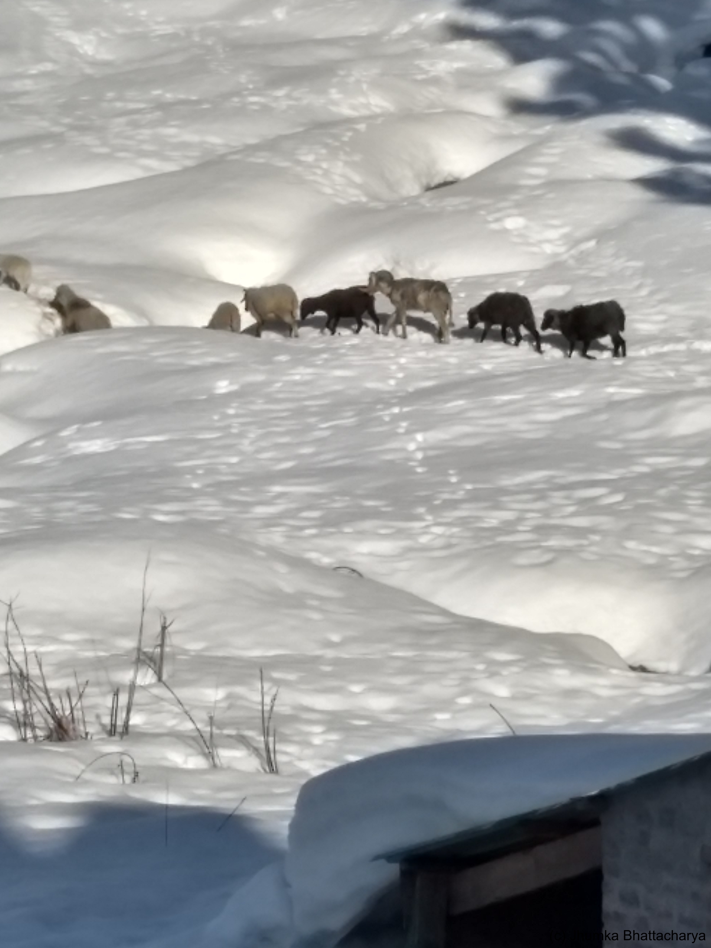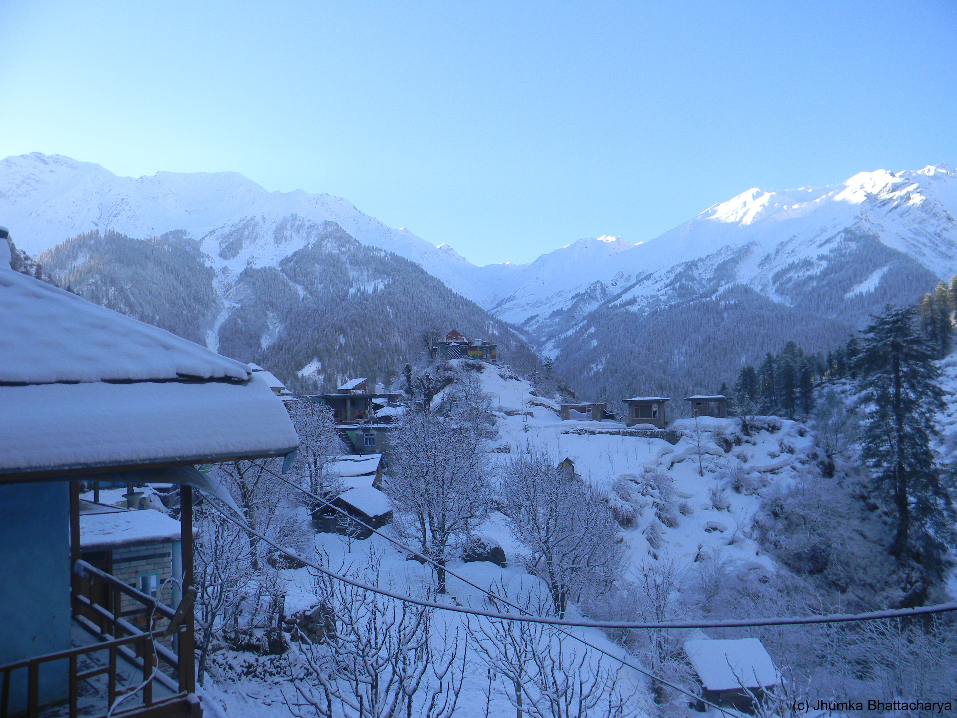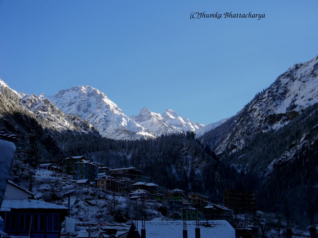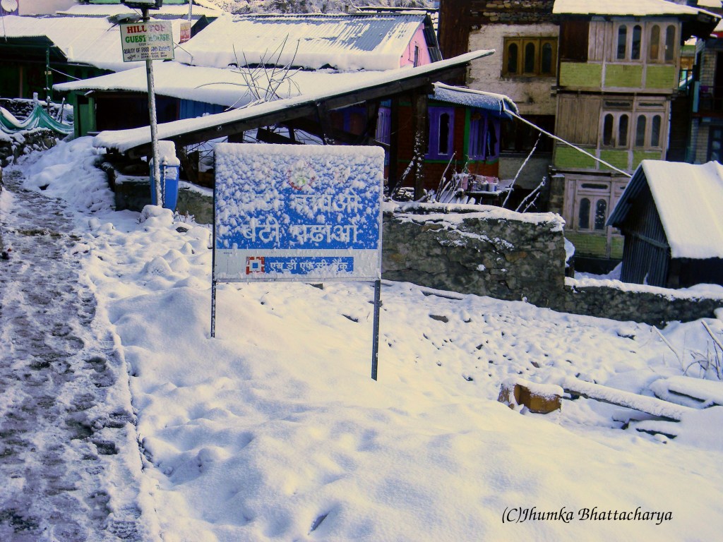 It was an extraordinary experience to sit in their balcony. As far as I could see all around there was snow. The village was surrounded by snow covered mountain ranges. I wished to walk around but did not get the courage to move in the ice. So I kept on watching the nature sitting on the balcony till dusk. It became very cold as soon as the sun set. I felt comfortable to sit by the fireplace in their living room. The wife of the home-stay owner made roti sabzi at night. The taste of the sabzi was different from other places of Himachal and delicious also. The beauty of Kalga is still very pristine because of it’s remoteness. If the road is made that will bring economic development for the locals, but may not prove beneficial for the travelers like us who seek solitude and natural beauty.