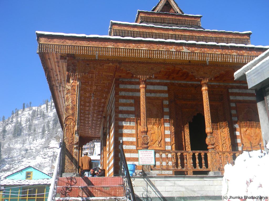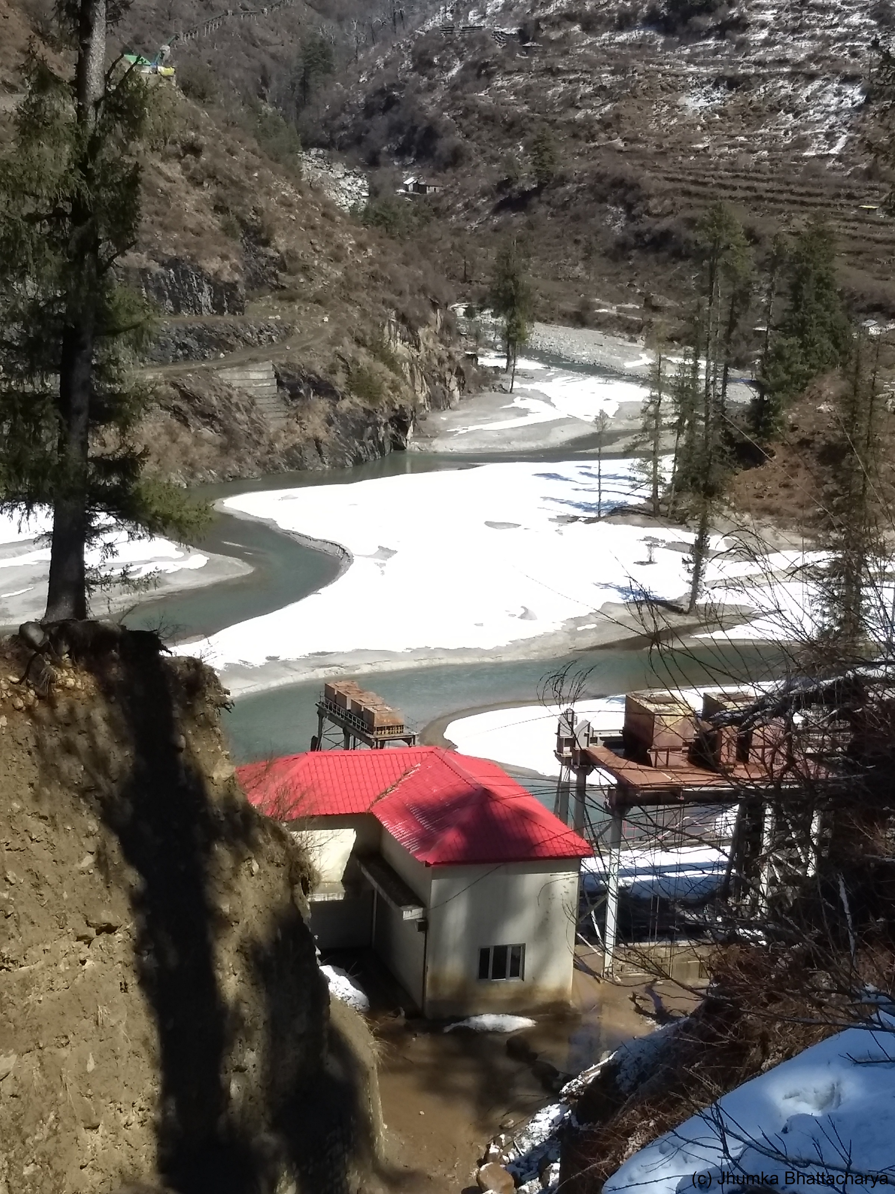Kalga is a small village in Parvati valley. It is not a very popular tourist destination. To reach Kalga one has to trek 2 km uphill from the main road crossing the barrage on Parvati river near Barsiani. When I went to Kalga in 2019 March I heard that the local authority was planning to make a motorable road to reach the village. I went to Kalga from Tosh. I took a porter from the barrage because the road was slippery due to ice, and it was risky for me to walk alone on the steep hilly path with a heavy luggage on my back.