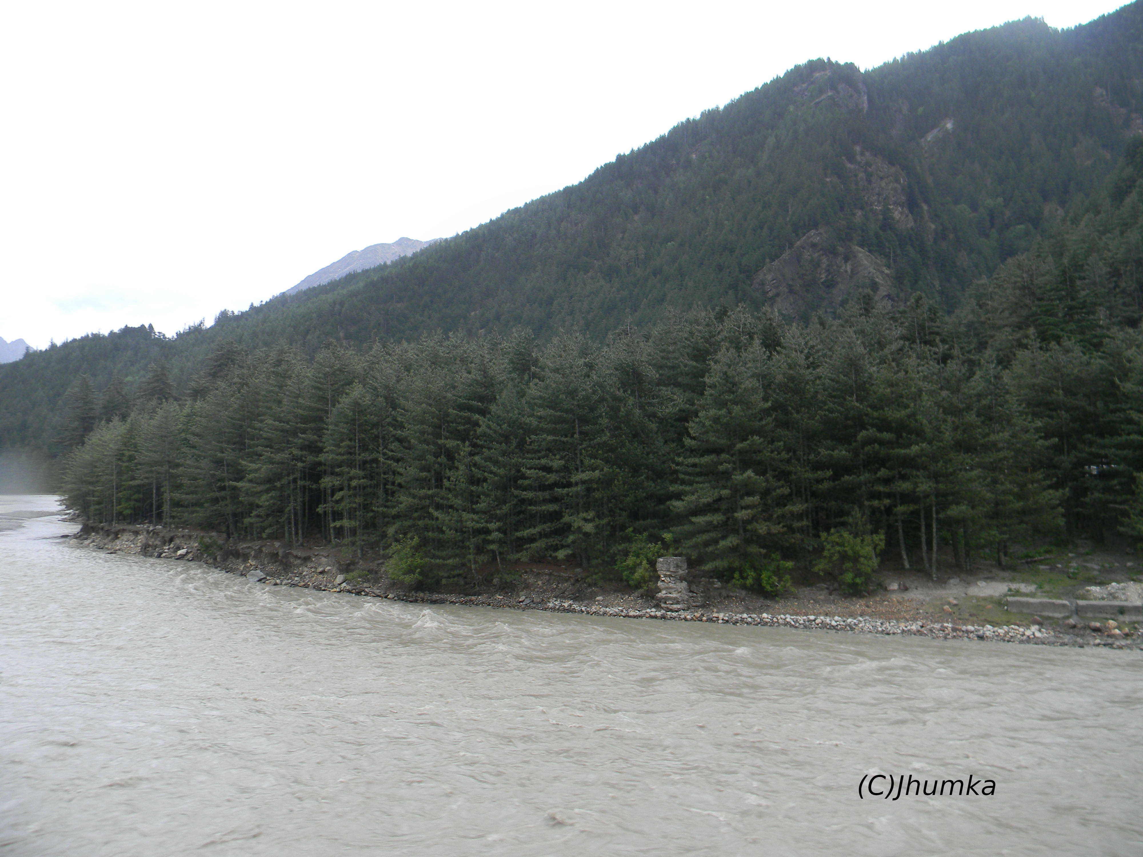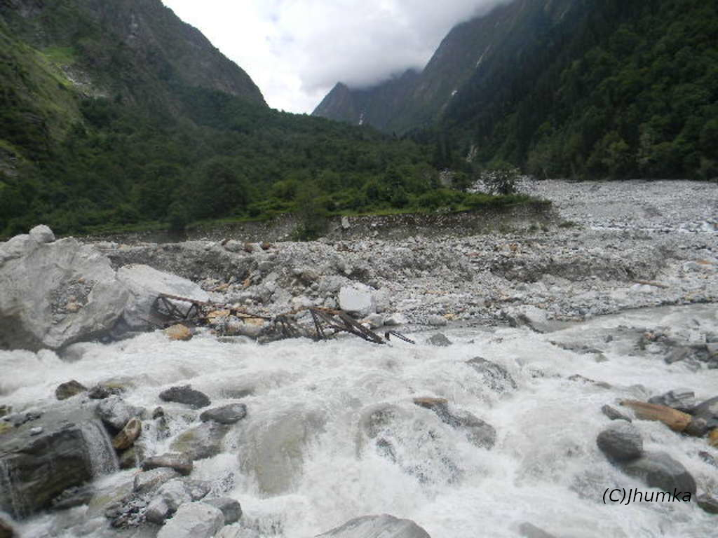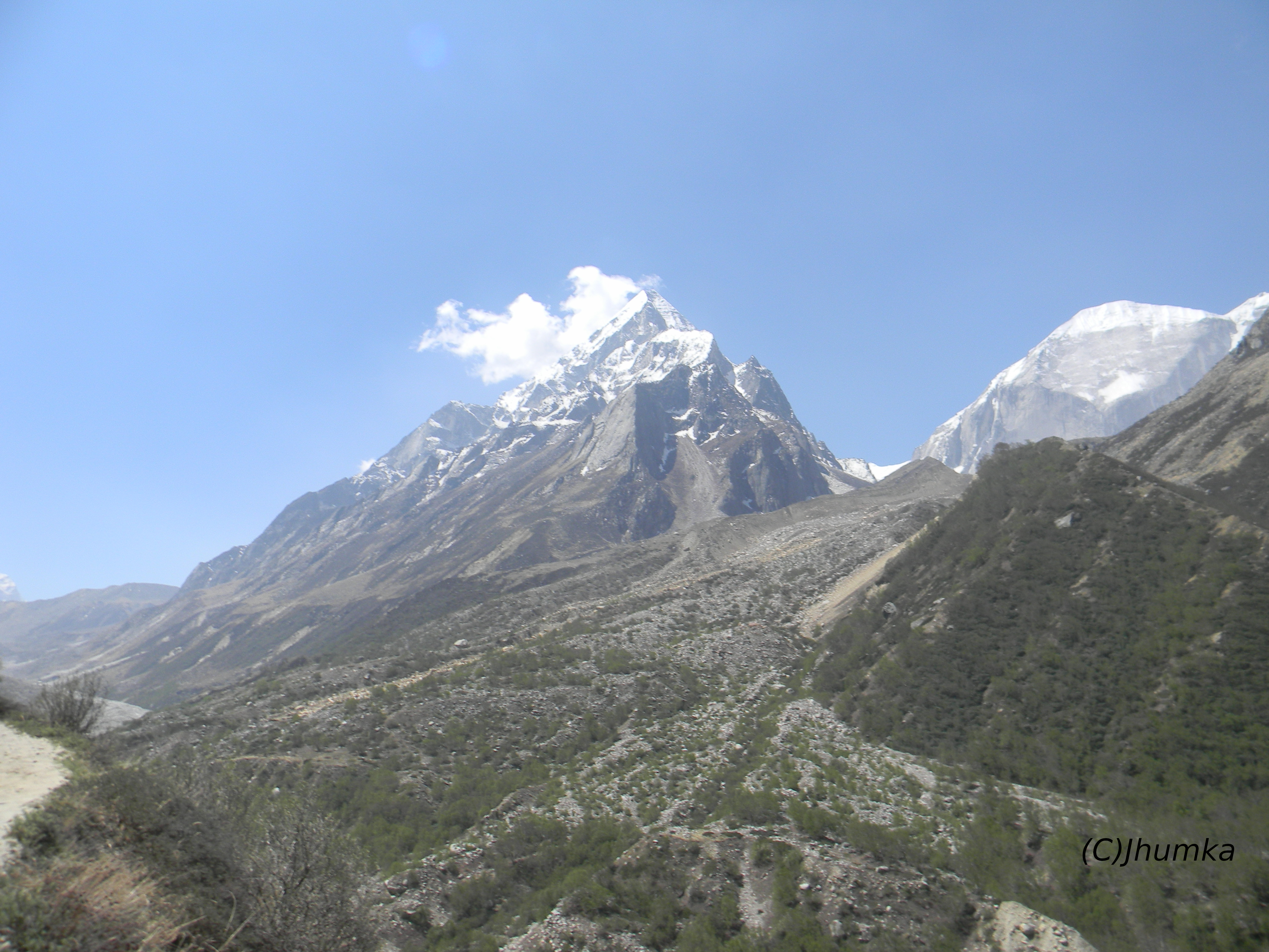 Dantu is a beautiful small village with the view of Panchachulli peaks. We spent two nights there at the home stay of Mr Mahesh Jung. His brother Manoj ji was a great cook. First morning was a little cloudy. All the peaks were not visible. We felt a little disheartened. Everyone of our team went to the base camp and zero point after puri vaji breakfast, while I stayed back sitting idle, baking myself under pleasant heat of sun, watching nature. Dhauli Ganga river initiated from the glacier of Panchachulli.