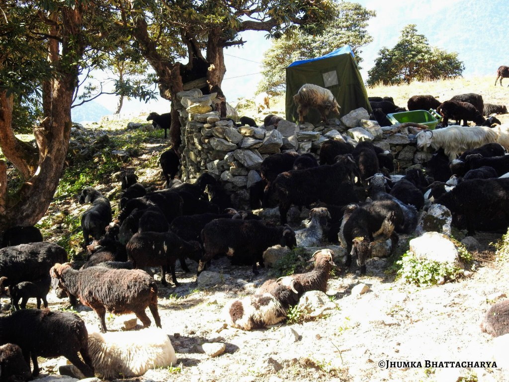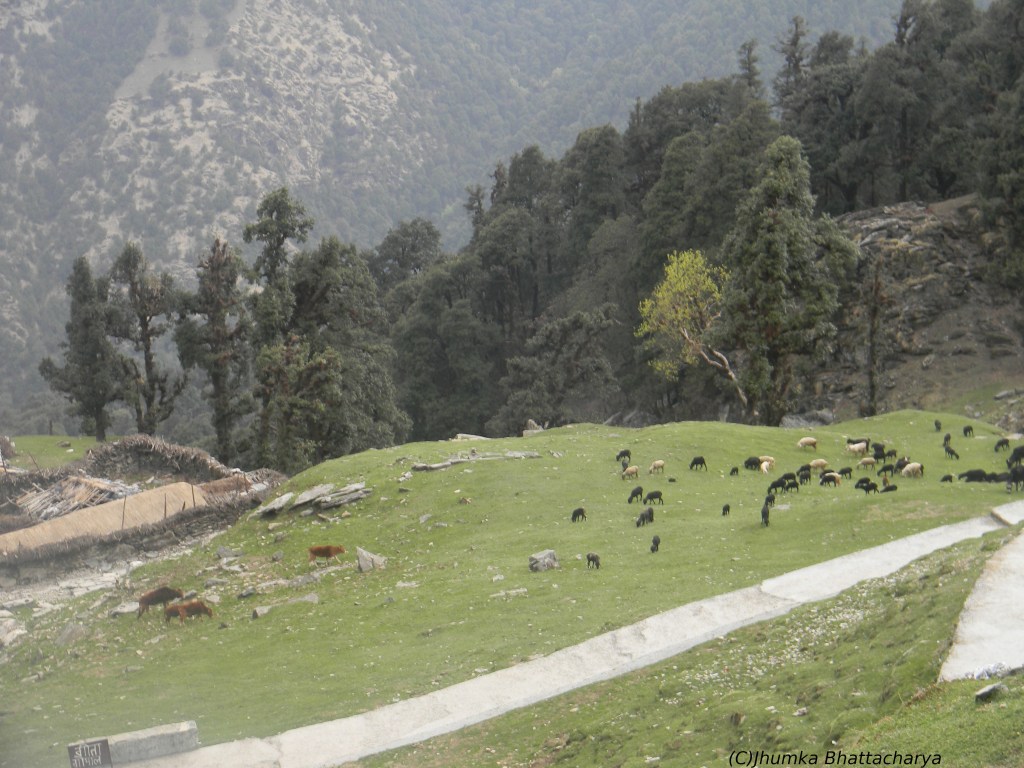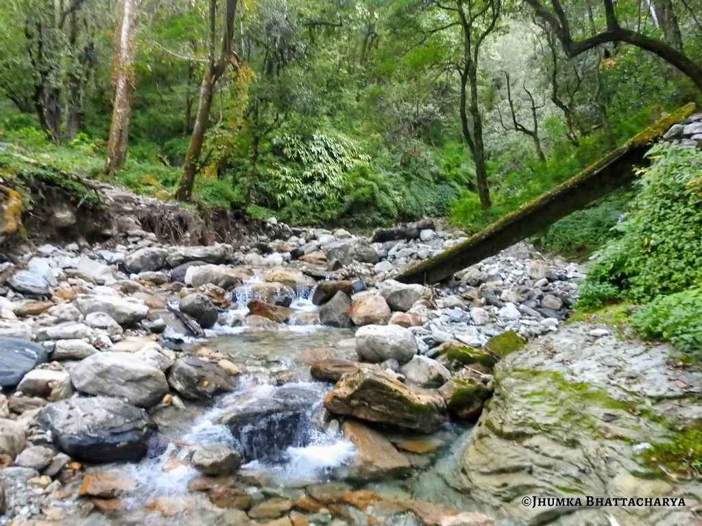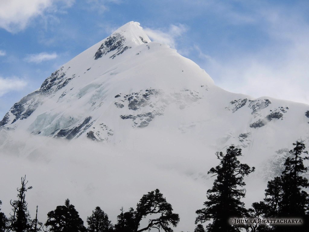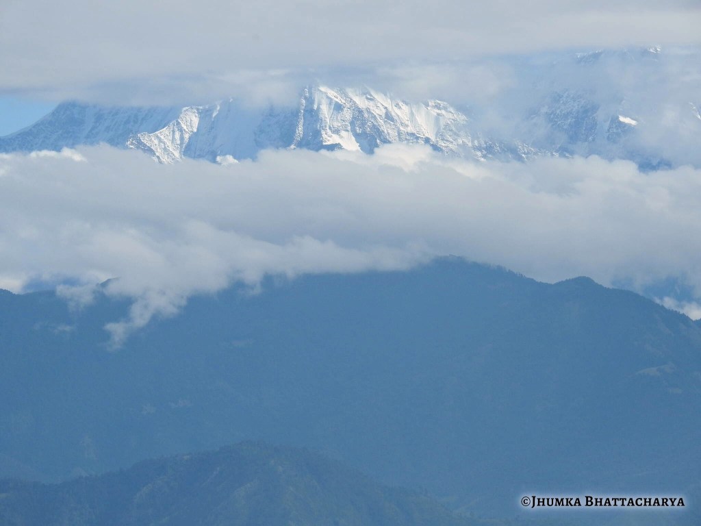 Dantu is a beautiful small village with the view of Panchachulli peaks. We spent two nights there at the home stay of Mr Mahesh Jung. His brother Manoj ji was a great cook. First morning was a little cloudy. All the peaks were not visible. We felt a little disheartened. Everyone of our team went to the base camp and zero point after puri vaji breakfast, while I stayed back sitting idle, baking myself under pleasant heat of sun, watching nature. Dhauli Ganga river initiated from the glacier of Panchachulli.