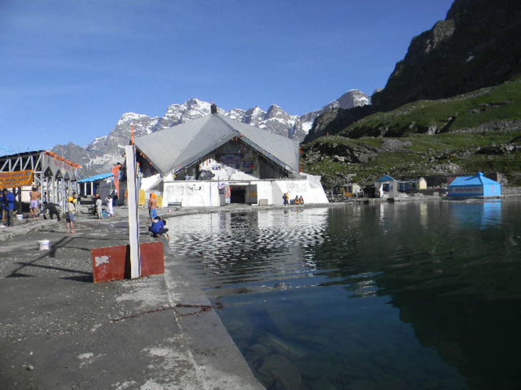 Next morning I went to Hemkund Sahib by pony. It is a famous Sikh pilgrimage. This road was tougher and steeper than Valley of flowers. There was a Gurudwara at Hemkund. The water of the lake was partly frozen though pilgrims were bathing in it. I visited the sacred lake and the Gurdwara, sat there for sometimes, then had food from langar and waited for the other two Sikh pilgrims who came with me on ponies. There was a temple of Lakshman behind the Gurdwara. Laksman Ganga flowed by its side. I visited that temple. When I came down to Ghangharia it was 1 pm. In front of my hotel I found the same pony owner who brought me to Ghangharia. He asked me if I wanted to go back. I asked him to wait for me a while. I packed my things and came out. I wanted to leave the place because mobile net work was not available there, and I was afraid that if any disaster happened again I should be trapped there, and my son would get terribly worried for me.