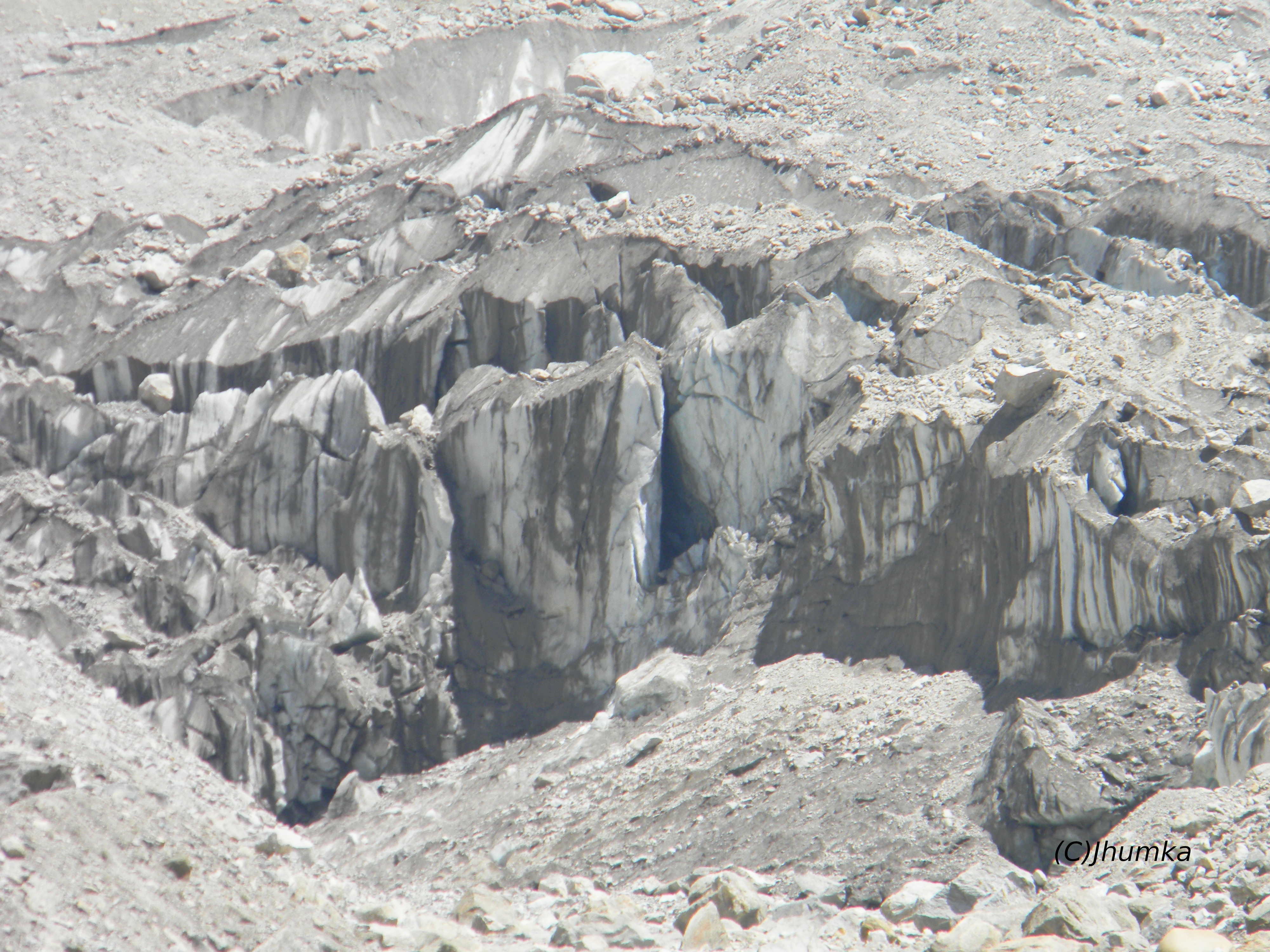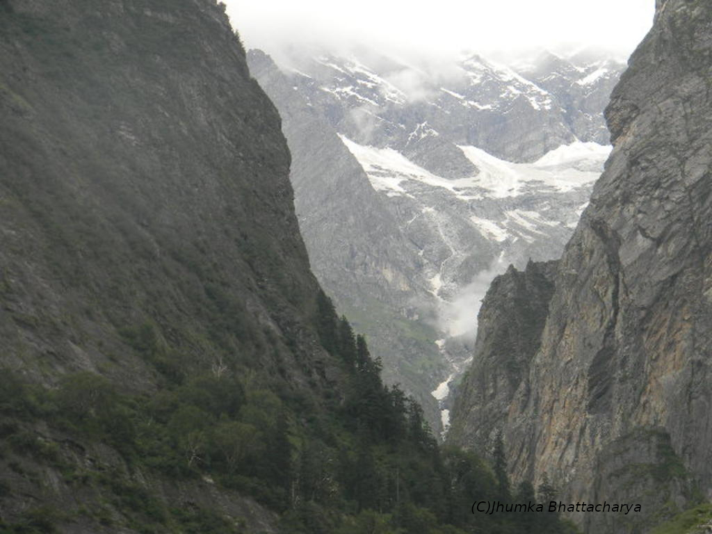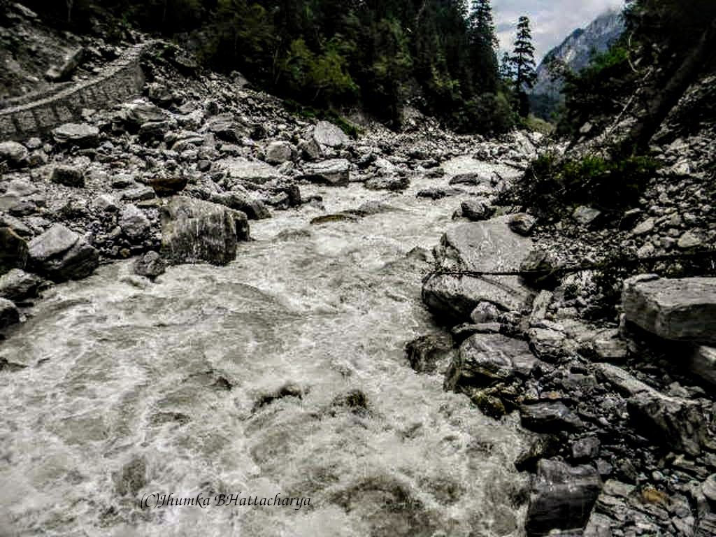 I started in the morning at 6 AM, I rode the pony. After going for a while the pony denied to go ahead and turned backward. It seemed that she was unwilling to carry me. Somehow the syce and the guide made her going on the way. Then I came to know that the pony was a very young one and the syce was a new one. This is his first trip on the way to Bhojobasa. The guide said that there was nothing to worry because he was quite acquainted with the region. But I had not been comfortable on the back of the pony and had a feeling that my seat was moving. The syce said to me not to get afraid and stick on to the seat. Then suddenly the saddle tilted completely and I fell from the pony where the path was hardly 3 feet wide and river gorge was straight 200 metres deep beside the path. Suddenly the guide came, as I was slipping down under the horse, he caught my legs and saved me from falling. I was terribly scared, he asked to rest, then I walked about one and half kilometer, after that I somehow reached Bhojobasa on the back of the pony.