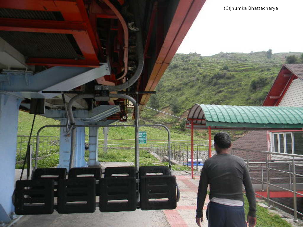 I kept my luggage under their custody and had my lunch. At 3-30 PM the cable car dropped me on tower number 8 as I wished to stay at GMVN tourist lodge. I got down from the tower and reached the point descending about 200 staircases from where the chair car plies for that tourist lodge. It was drizzling. The operator said that he could not run the chair car for a single traveler. He needed at least two. I was desperate, there was no other option for me except buying two tickets. The experience was unique, it was just like a dream where I was the queen of the place.